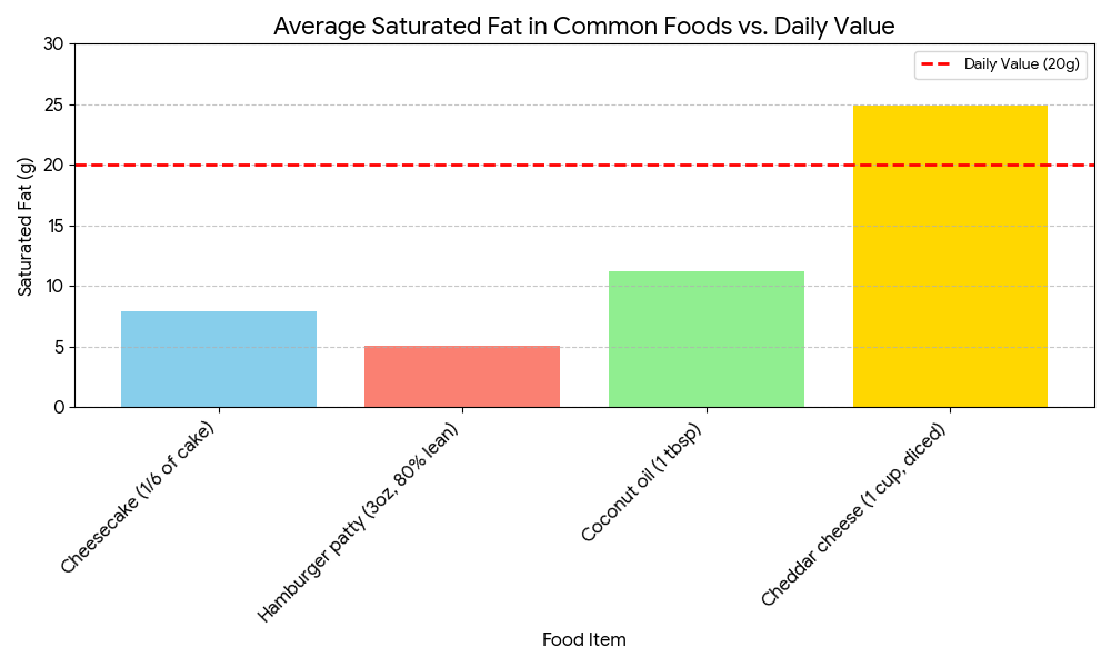This type of fat can raise your cholesterol levels, increasing your risk of heart disease. The Daily Value for saturated fat is 20 grams. The goal is to keep your intake of saturated fat low. Be mindful of the %DV on food labels and choose alternatives with lower percentages.