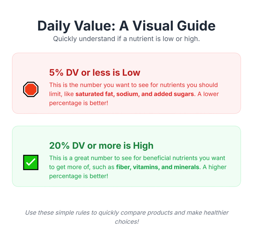 Now that you understand the mechanics of the Daily Value, it’s time to put that knowledge into action. Use the %DV as a tool for quick comparisons. When you’re in the grocery store, don’t just pick up the first option that looks good. Take a moment to look at the labels of a few different brands of the same product. Compare their %DV for sodium, saturated fat, and added sugars. Choose the one with lower percentages for these nutrients.